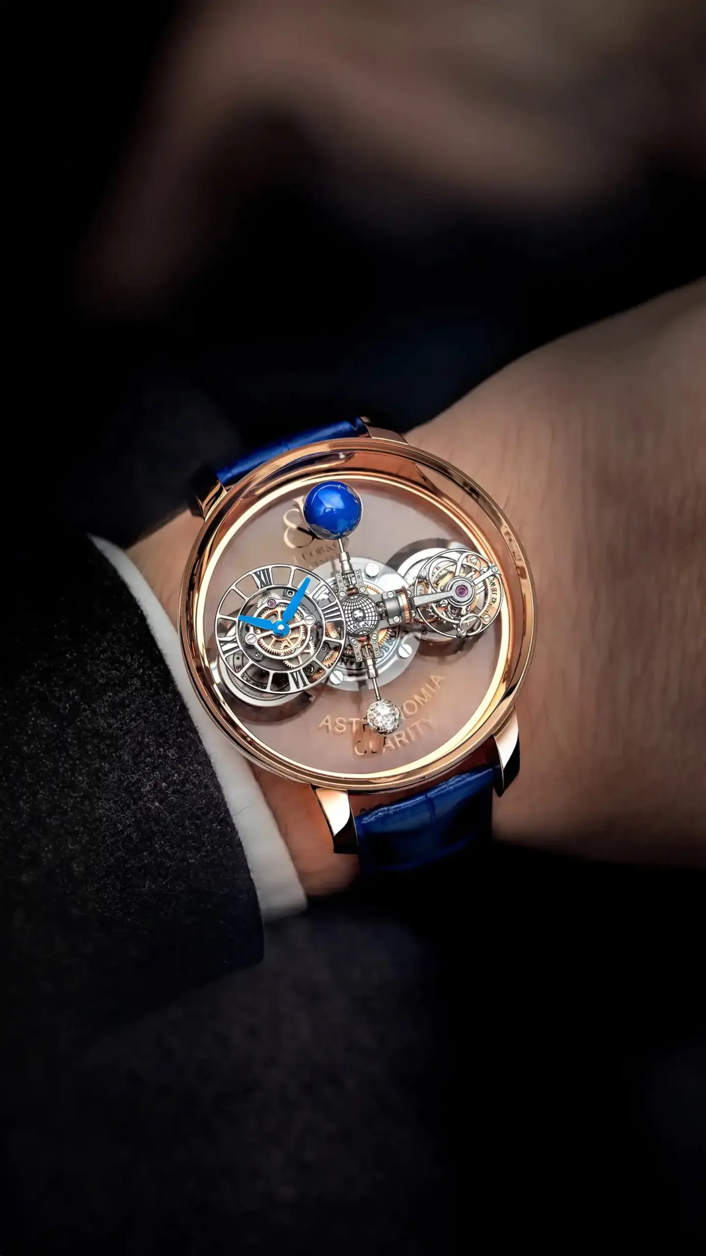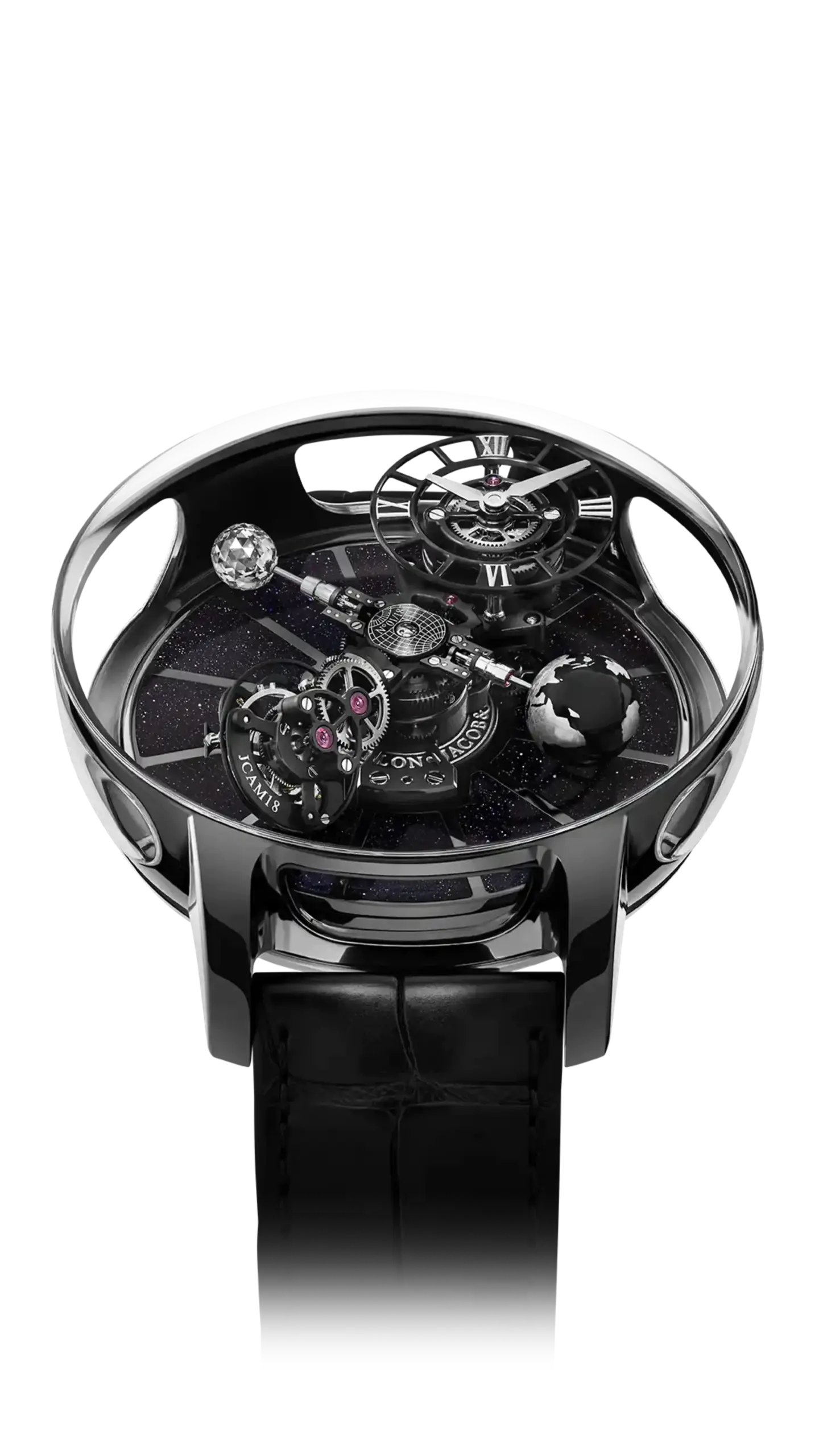 Creating a miniature, mechanical solar system required going beyond all preconceptions, innovating and breaking barriers, like space exploration. Caliber JCAM10 is one of the most advanced and complex movements in the Caliber JCAM10 is a three-dimensional movement with a central, vertical axis. It carries four satellites. All of them rotate on their individual axis, and around the central axis. A triple-axis tourbillon, a diamond moon, an Earth globe, a rotating dial, its complications take on the form of planetary bodies. Orbits are defined by their speed. The rotation of Astronomia’s central axis impacts energy management, power reserve and most of all, the impression Astronomia leaves on the viewer. The platform’s full rotation takes 20 minutes.