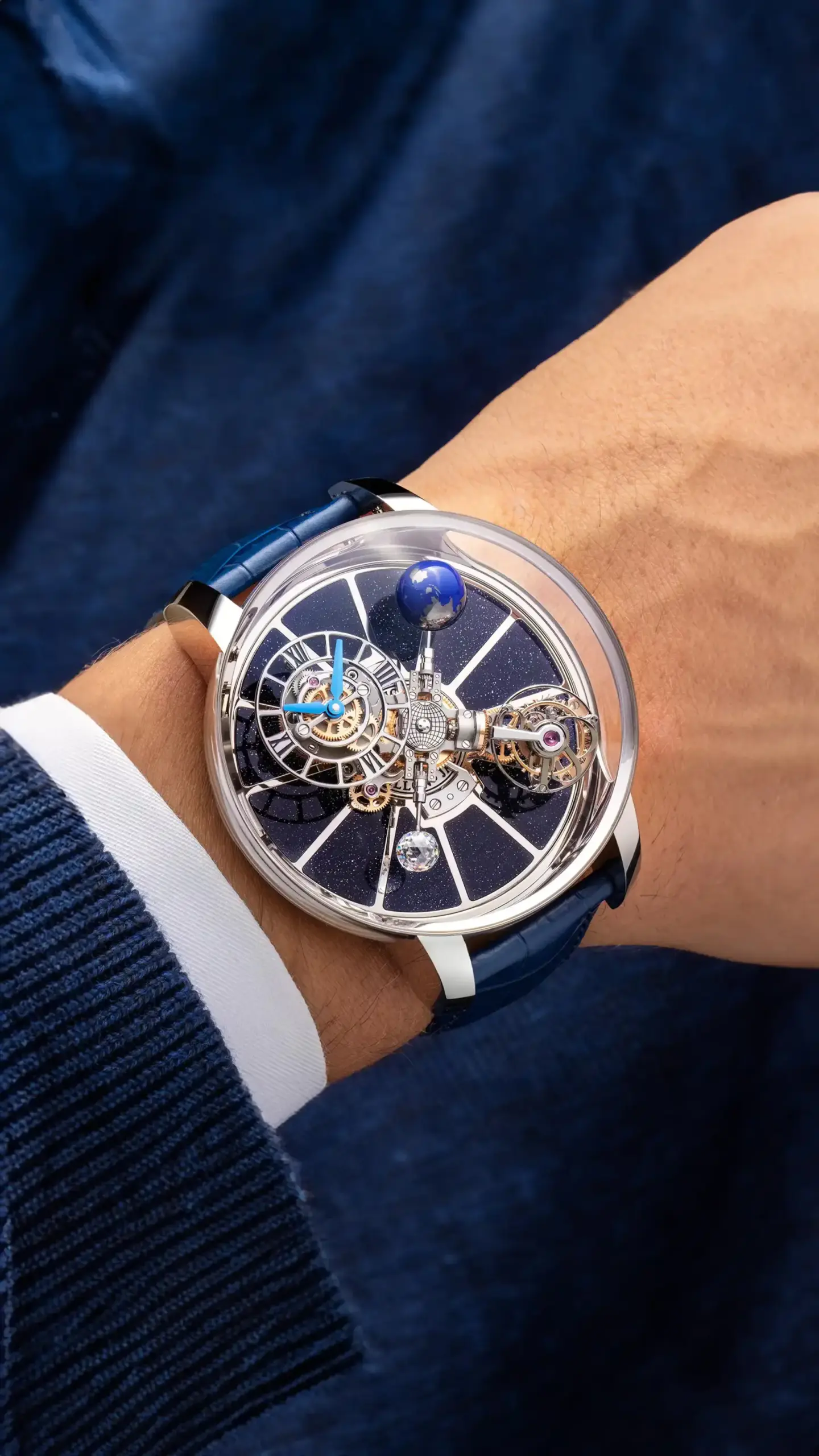 As Astronomia Tourbillon represents a solar system, it contains our home planet. Crafted out of magnesium for lightness, earth is hand-lacquered in blue for likeness. The shape of emerged grounds and continents is clearly visible. This Earth spins on its own axis every 60 seconds.