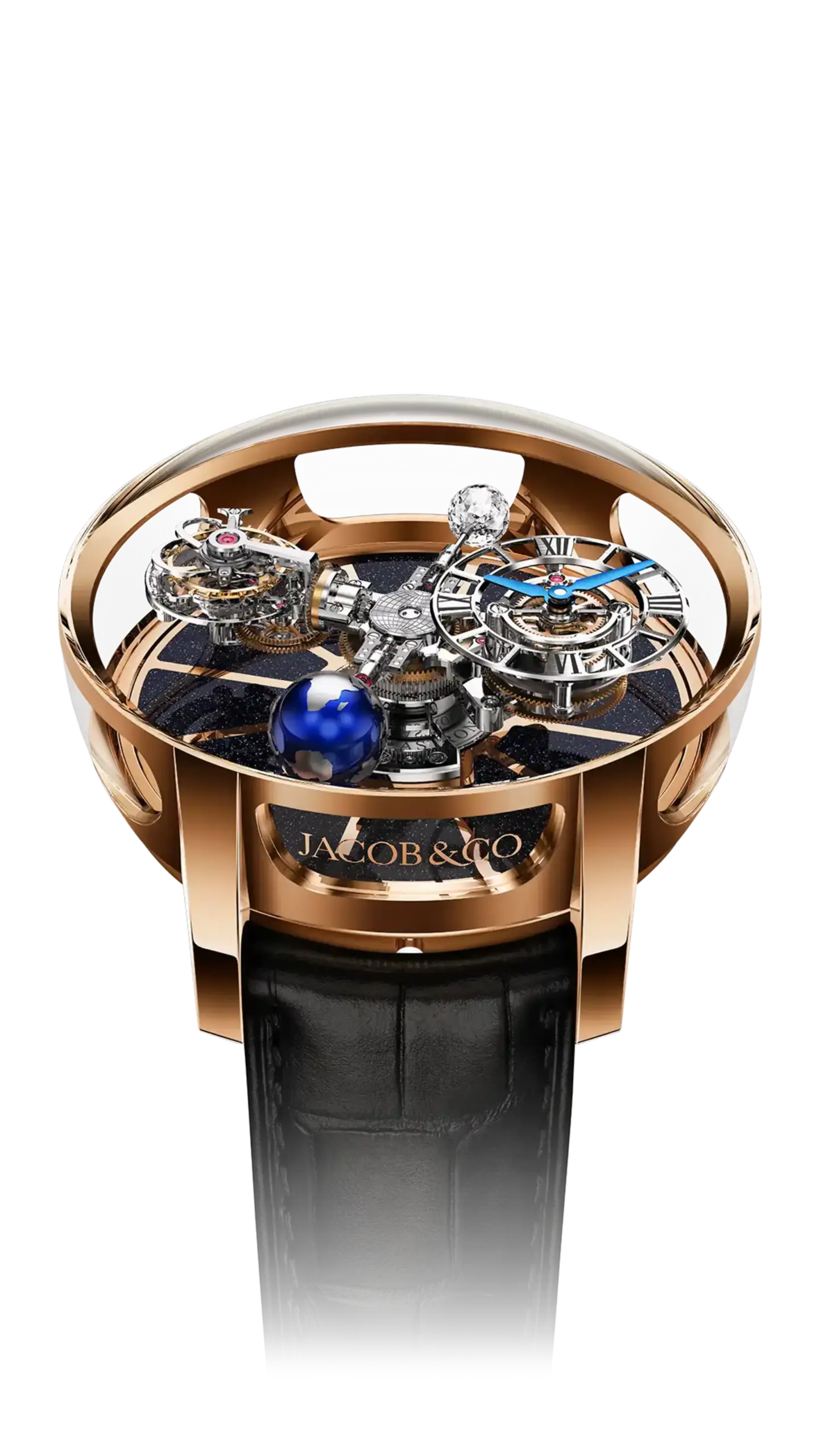 Celestial bodies and space exploration have long driven Jacob Arabo’s creativity. In 2014, he translated his intimate passion into an ambitious timepiece concept. Astronomia Tourbillon is an unheard-of translation of astrophysics into watchmaking form. It is a wrist-sized model of a planetary system and its constant motion. The Astronomia Tourbillon case is designed like an astronomer’s observatory. A vast sapphire dome on top and sapphire panels on the caseband open a galaxy-wide view. The aventurine base plate shines like a starry sky at night. A diamond-made moon and a blue lacquer earth come alive with the combination of design and horology. Astronomia Tourbillon is pure movement, at a level of complexity and beauty that makes it unique.