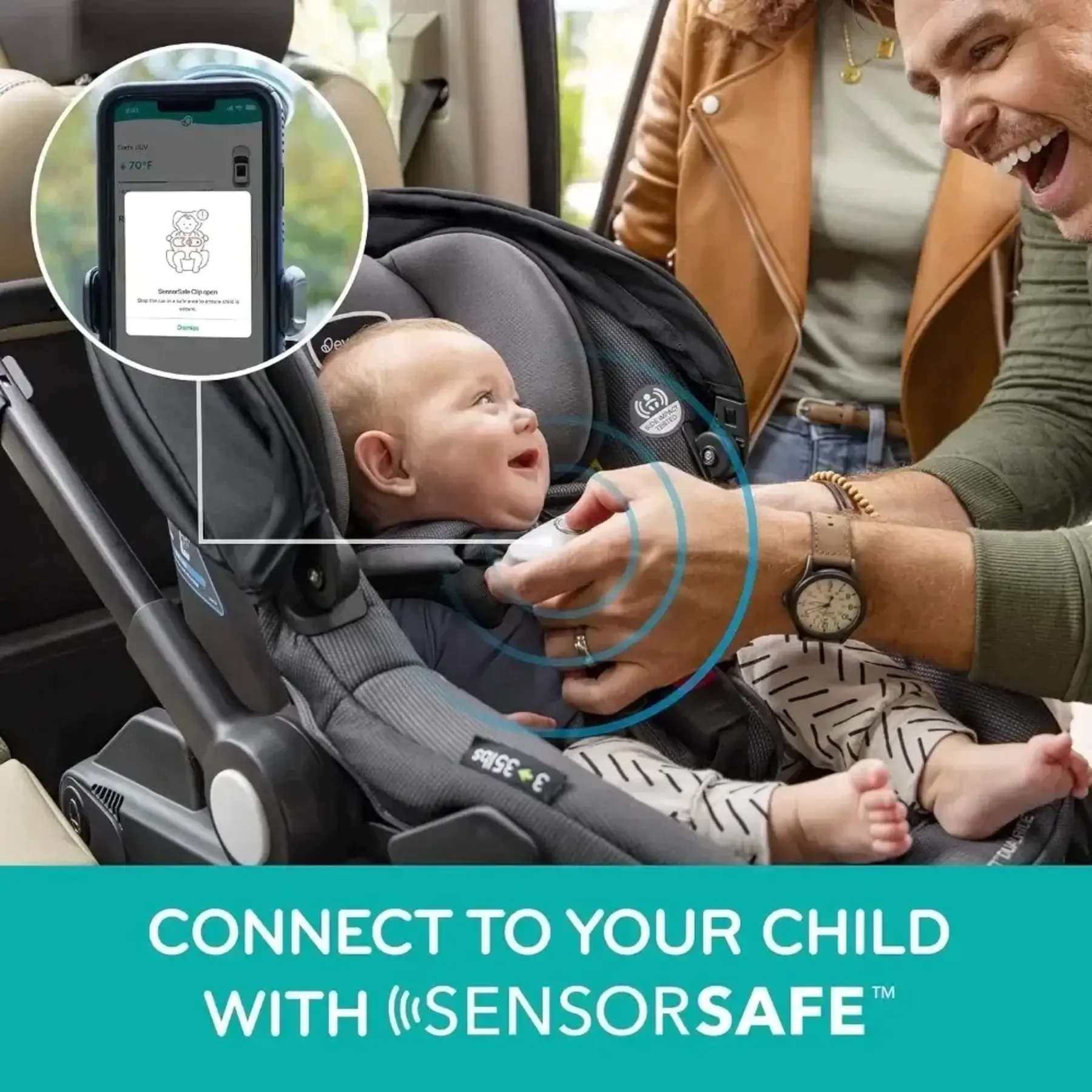 Alerts for unsafe temperature, chest clip, time seated & unattended child.